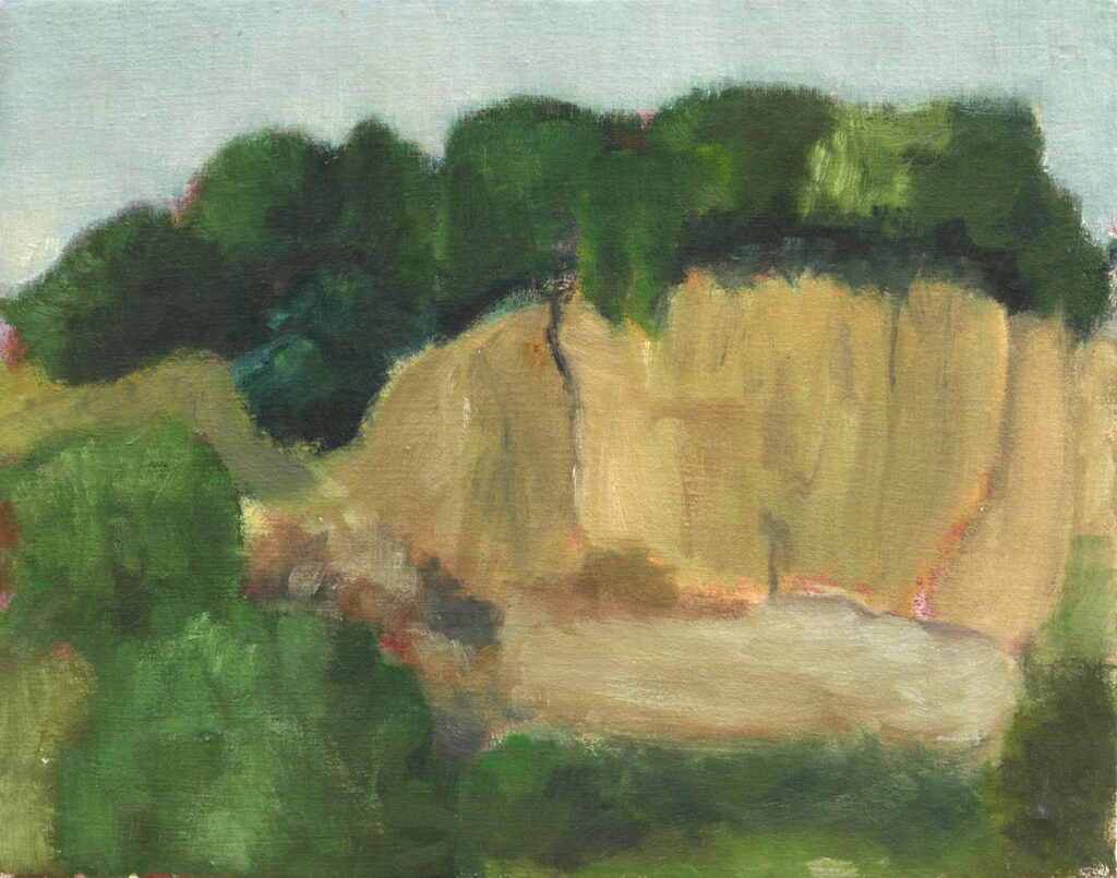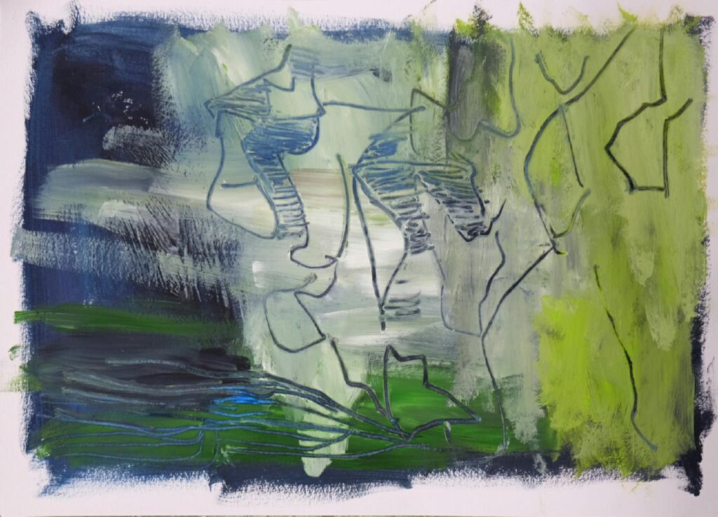 Durch unsere Seherfahrungen in der Welt reicht schon eine angedeutete Horizontlinie, um die Erinnerung an Landschaft hervorzurufen. Dies nutzen wir um über eine locker angelegte Situation in ein spielerisches Arbeiten zu kommen.